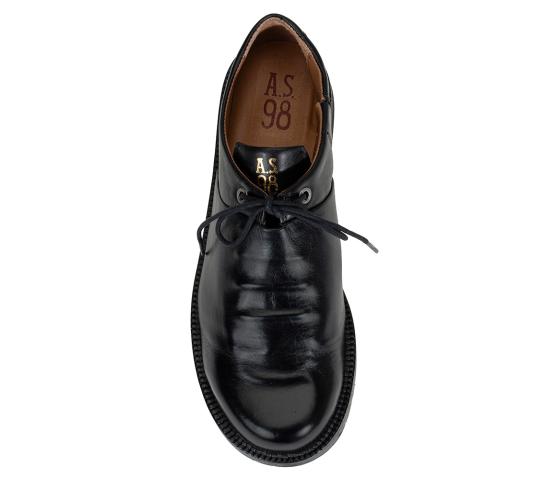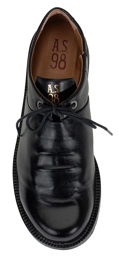 En meget flott pensko fra italienske A.S.98 med gummisåle. Med liten elastikk på innsiden og snøring helt øverst. Dette er en klassisk snøresko som alikevel skiller seg ut, også med den lille rynkeeffekten på skoens overdel og den avrundede tuppen. God gummisåle og meget myk innersåle.
