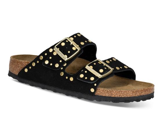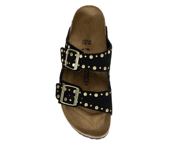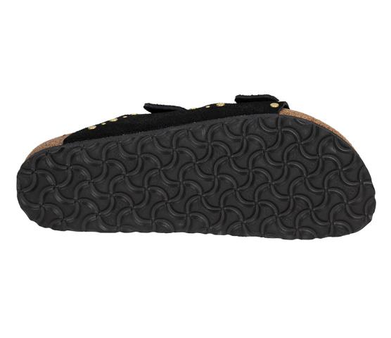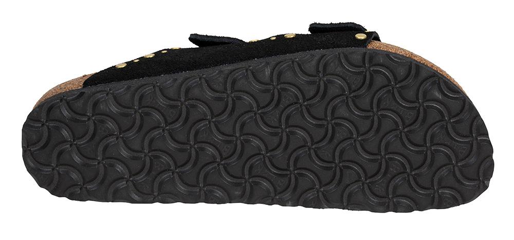 Arizona får du her i mykt, semsket skinn, med tøffe nagledetaljer på remmene. Birkenstocksandaler er kjent for sin ergonomiske form, og sålen er bygget opp av fem lag. OBS! Denne modellen er "smal", hvilket vil si at den er normal i bredden.