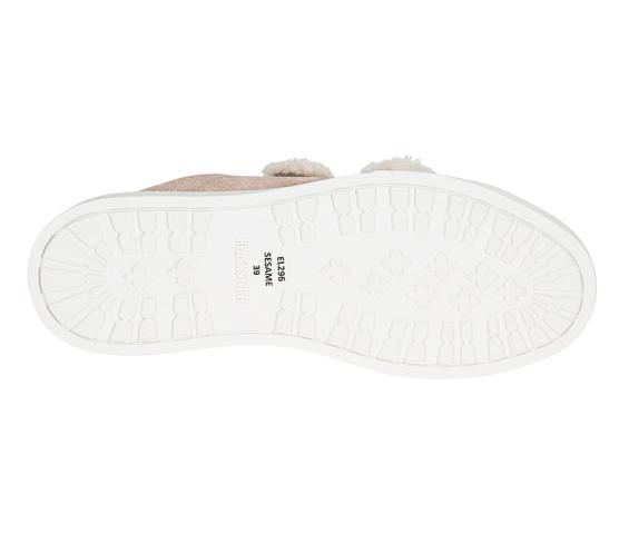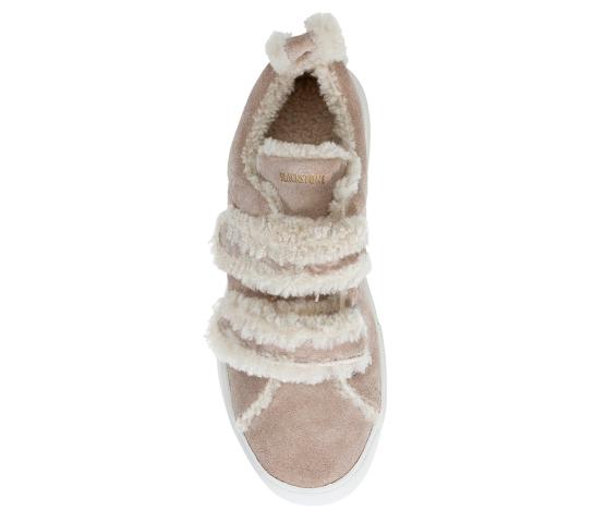 En søt og kul sneakers med borrelåser og saueskinnsfôr. Perfekt for deg som ønsker en nett sko, men ikke vil fryse på beina. I beige, semsket skinn.