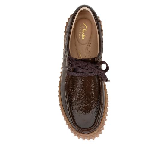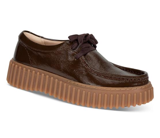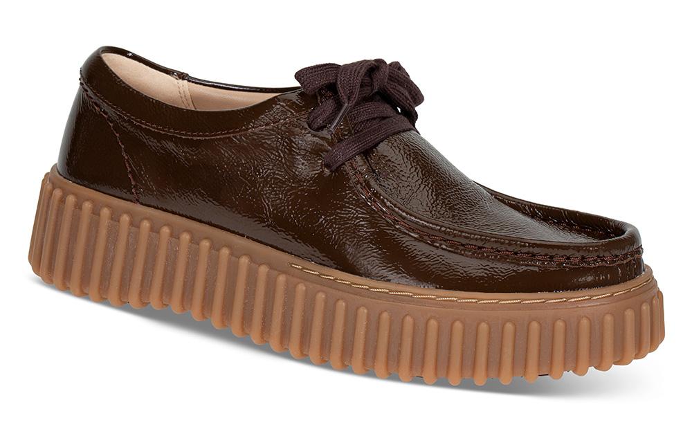 En modell fra Clarks arkiv som er blitt en ny hit! Torhill var en populær modell på 80-tallet og er nå tilbake. Denne gangen i mørk grønn skinnlakk, og med den klassiske creeper-sålen i gummi. Myk, pustende fotseng i skinn som er uttagbar.
