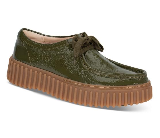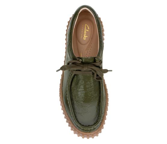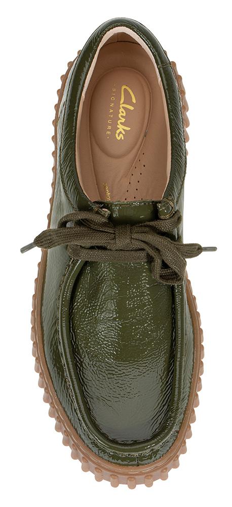 En modell fra Clarks arkiv som er blitt en ny hit! Torhill var en populær modell på 80-tallet og er nå tilbake. Denne gangen i mørk grønn skinnlakk, og med den klassiske creeper-sålen i gummi. Myk, pustende fotseng i skinn som er uttagbar.