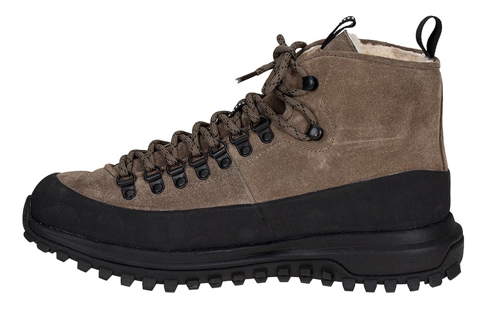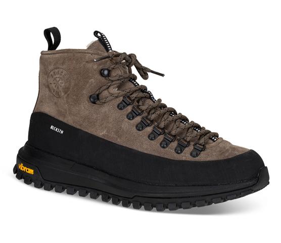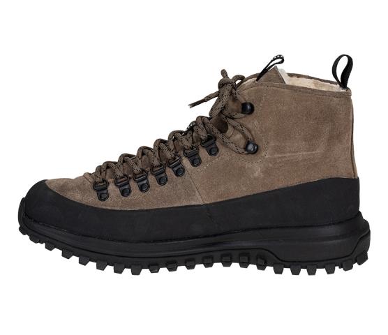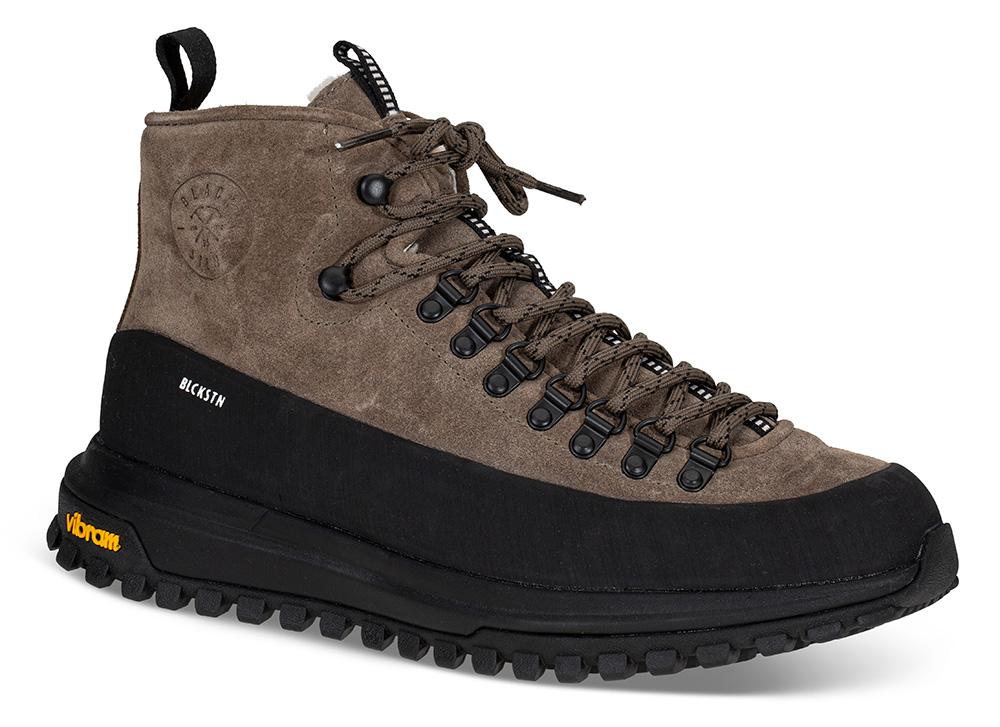 En robust og tøff vintersko fra Blackstone. I semsket, grågrønt skinn og med en bred, gummiert kant over den mønstrede Vibram-sålen. Selvsagt fôret med ekte saueskinn som holder deg varm på kalde dager.