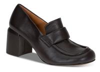Elegant gjennomført mokkasin med stødig blokkhæl trukket i skinn. Kul detalj med den tykke remmen over forfot og bred kant i front. Audley lager sko i det fineste skinn!