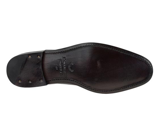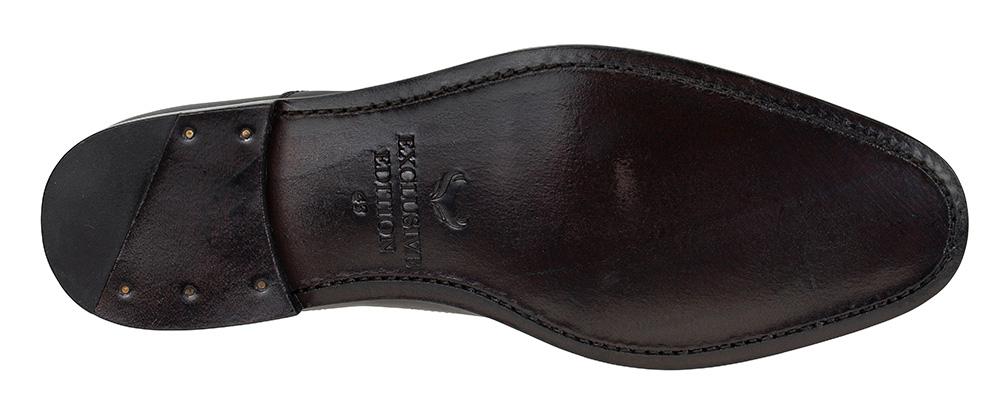 Toe cap. Lærsåle under, så vær varsom med bruk i vått vær. Tørk av med fuktig klut.