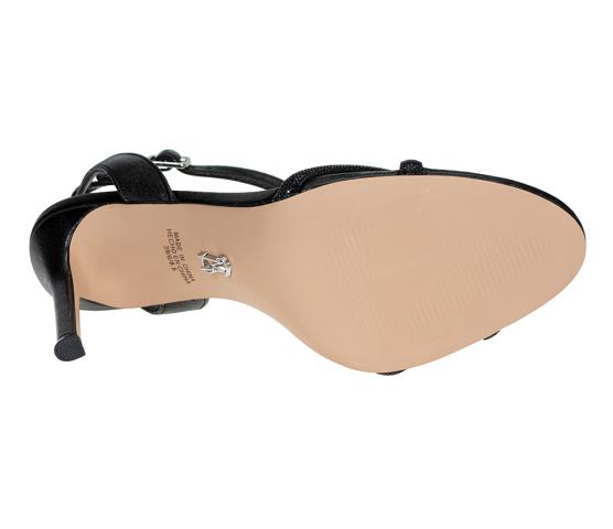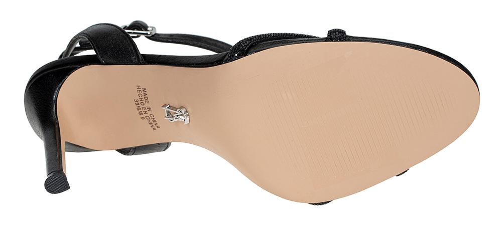 En fest av en pensko med åpen tå og rem rundt ankel. Høy hæl, glitterstropper i kryss i front og tynn stiletthæl. Wow!