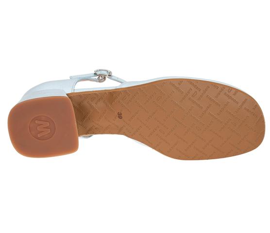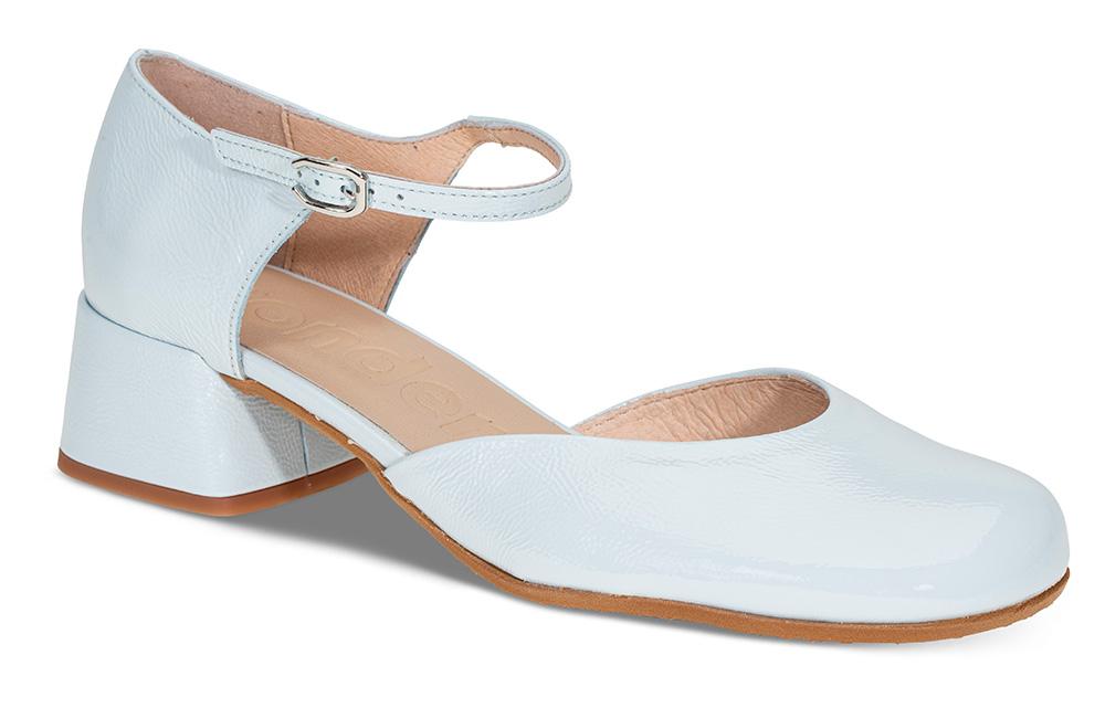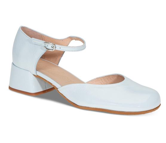En pensko i skinnlakk med lukket tå og blokkhæl fra Wonders. Med en smal rem med enkel spennelukking foran på ankelen. innersålen har MemoryGel for litt ekstra demping. Denne er bare for søt i sin lyseblå farge!