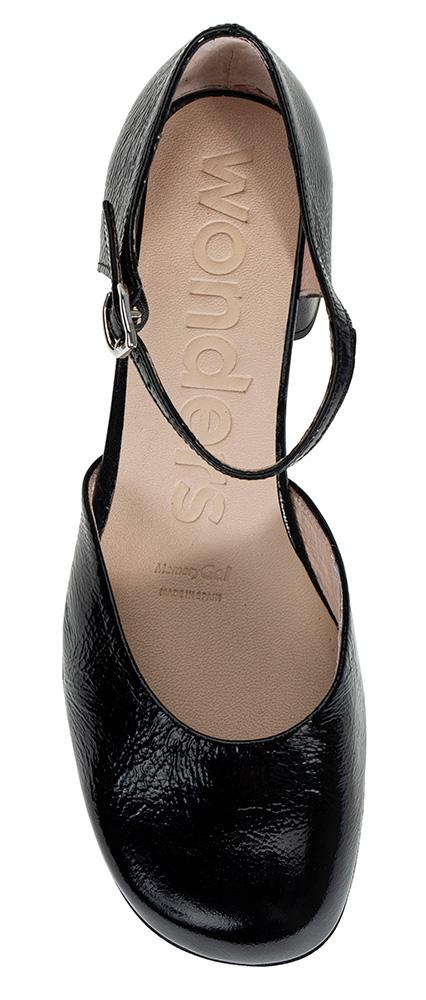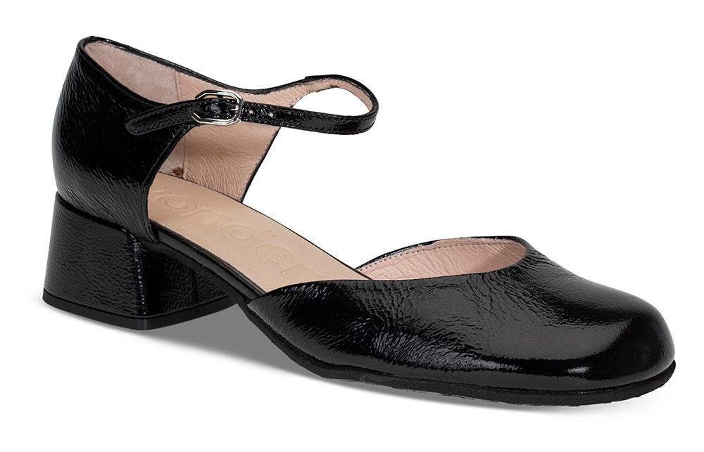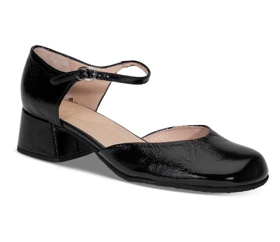 En pensko i skinnlakk med lukket tå og blokkhæl fra Wonders. Med en smal rem med enkel spennelukking foran på ankelen. innersålen har MemoryGel for litt ekstra demping. Denne er bare for søt!