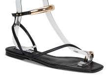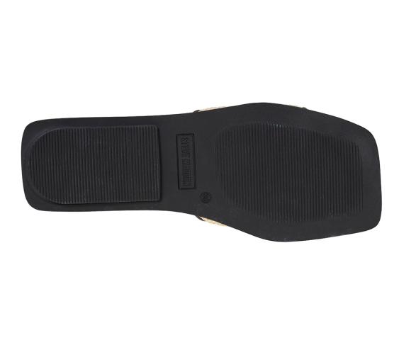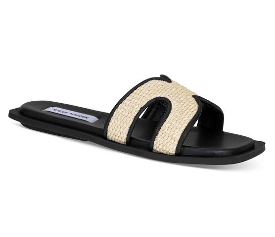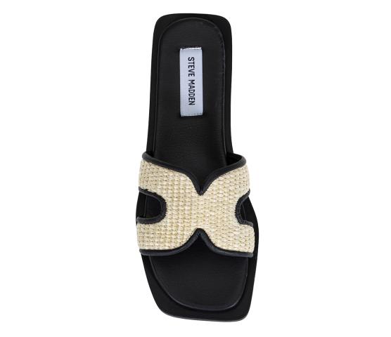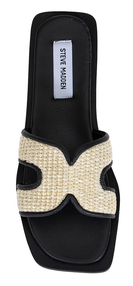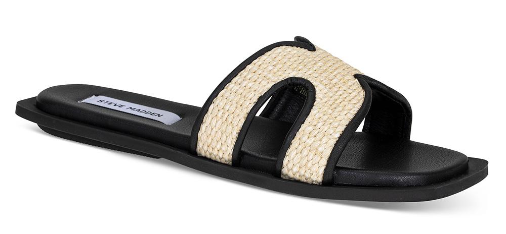 En flat sandal i overdel av raffia og sort kunstskinn. Firkantet form på sålen og en fotseng med avrunding i front og bak. En lekker sandal du kan pynte et antrekk med eller