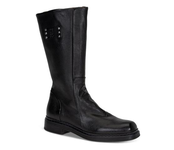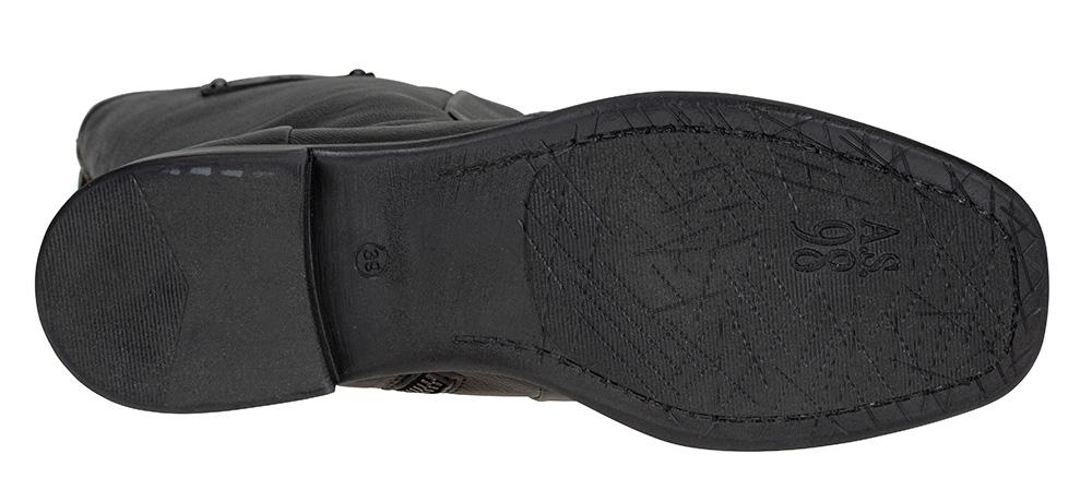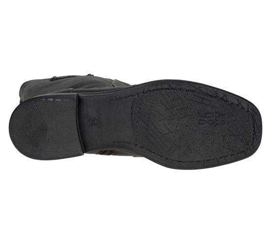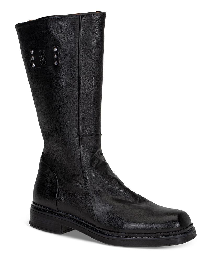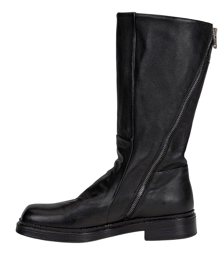 Støvlett med trekvarthøyt skaft i to lag flott skinn fra A.S.98. I utgangspunktet en stilren modell, men får absolutt det lille ekstra den skrå glidelåsen som går fra innsiden av skaftet og skrår opp bak. Den har også et skinnmerke på yttersiden festet med metallnagler. Firkantet tupp og lett rynkeeffekt foran for en tøff passform. Skaftet er også noe høyere foran enn bak.