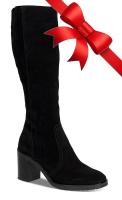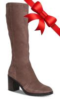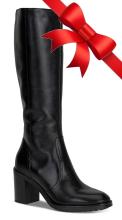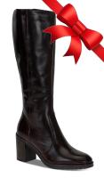 Høy støvlett med stødig, høy hæl og mønster under på sålen foran. I blankpolert skinn og med rund tupp. En fin støvlett til hverdag og fest! 1/2 pris. Fire varianter!