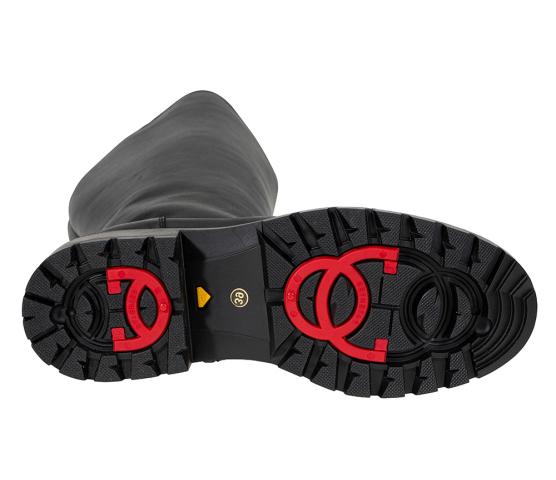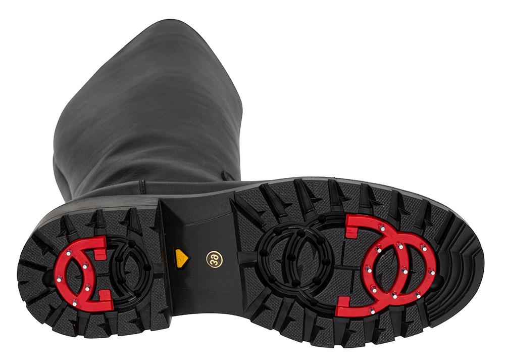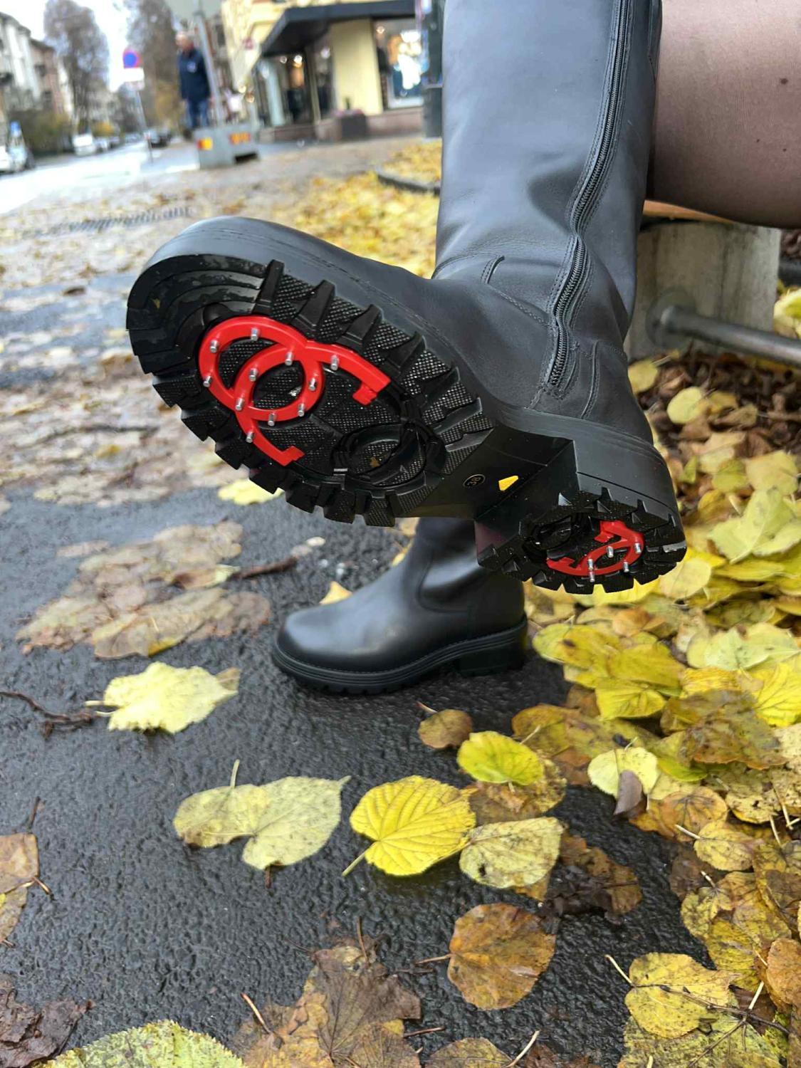 De to siste bildene viser under skoene med og uten piggene ut. Modellen har en gummisåle med en hæl på 5 cm.