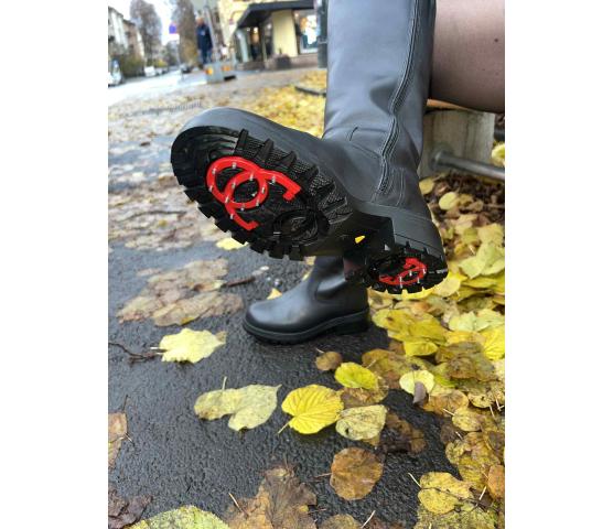 Piggsko! En høy, saueskinnsfôret støvlett - perfekt til vinteren. Skinnet er behandlet slik at den er også tilnærmet vanntett! Modellen har en gummisåle med en hæl på 5 cm. Det unike ved denne bootsen er at den har utvippbare pigger fra Alpi (de originale) under som er perfekt til glatt vinterføre. Redskap til å vippe de ut medfølger i esken.